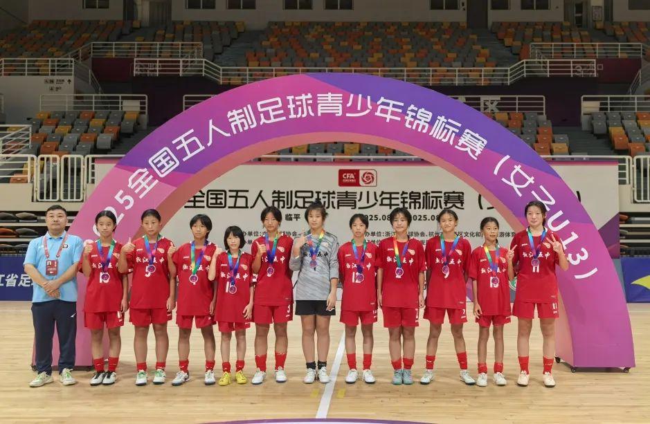 8月23日,2025全国五人制足球青少年锦标赛(女子U13)在浙江杭州临平体育中心体育馆圆满落幕。椒江区第五中学女子足球队一路过关斩将,最终斩获亚军,闪耀全国赛场。这是该校继2018年斩获全国青少年校园足球挑战赛(初中女子组)第六名后,再次在全国性赛事中突破自我,创造佳绩。